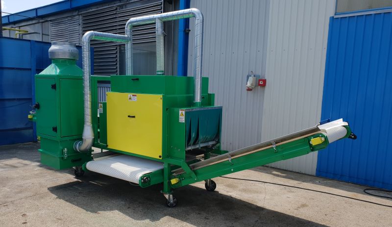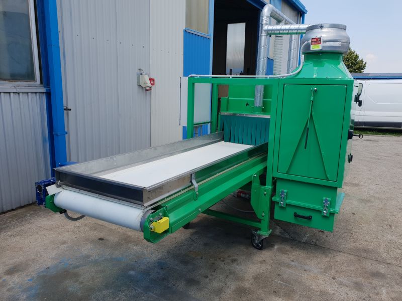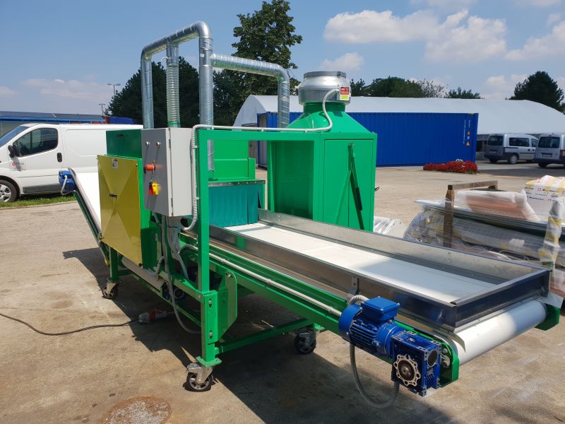 Processing material (dry and dryish) is dosed onto input conveyor of the machine. In the separator the flowers, seeds and leaves are separated from the stem. The machine has filter for collecting the hemp dust created due to the separation inside of the machine. After the separation, the mixed mass of separated flowers, seeds and leaves goes out on one outlet and the stem goes out on another.