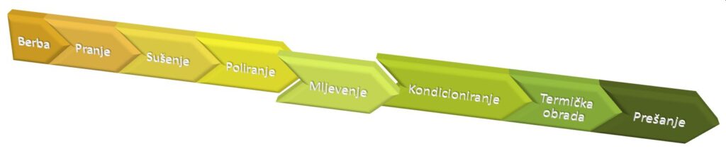 Mljevenje sjemenki uz dodatno pneumatsko čišćenje radi odvajanja težih frakcija (kamena i metala) i lakših frakcija (pahuljica i pljevice).