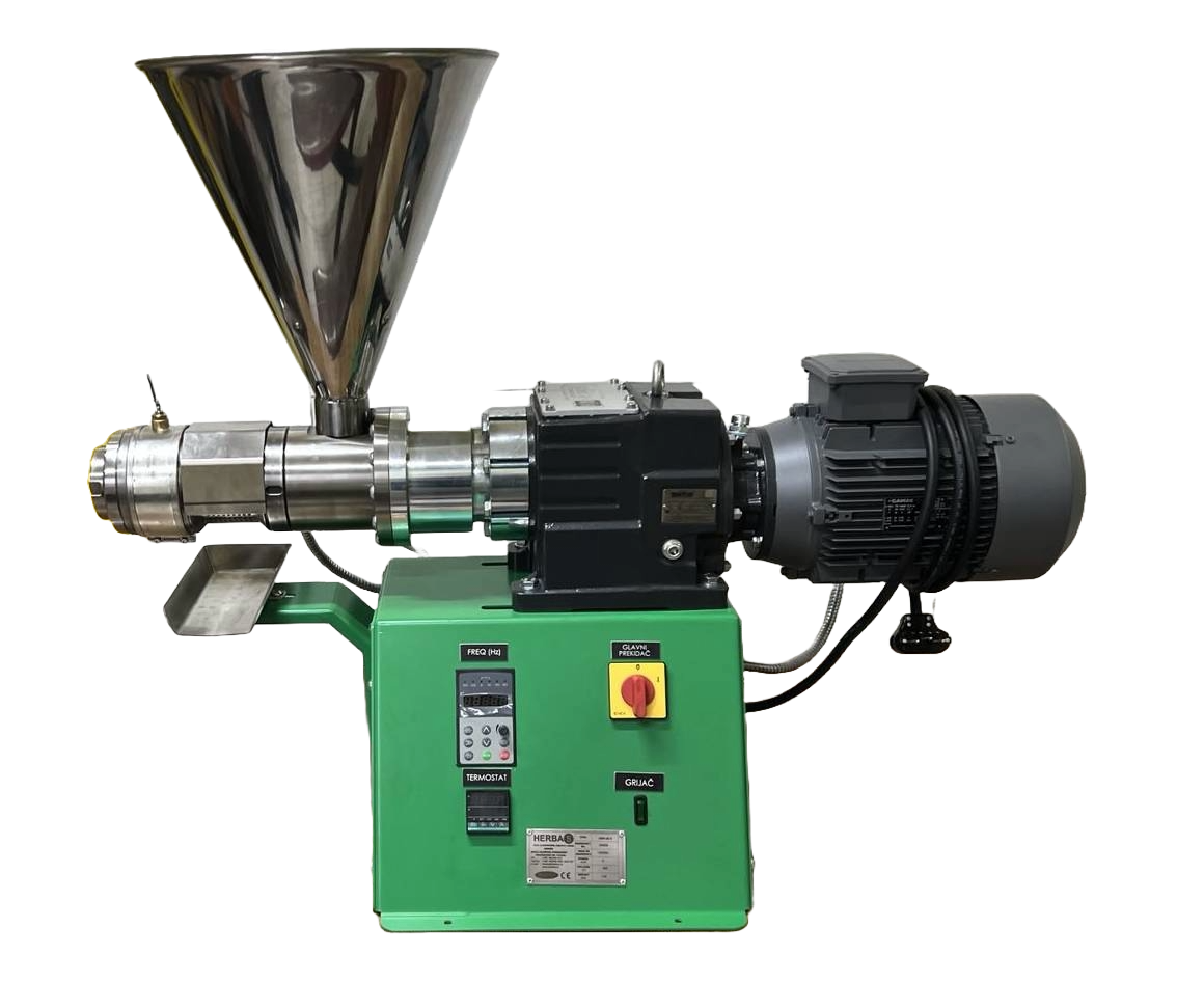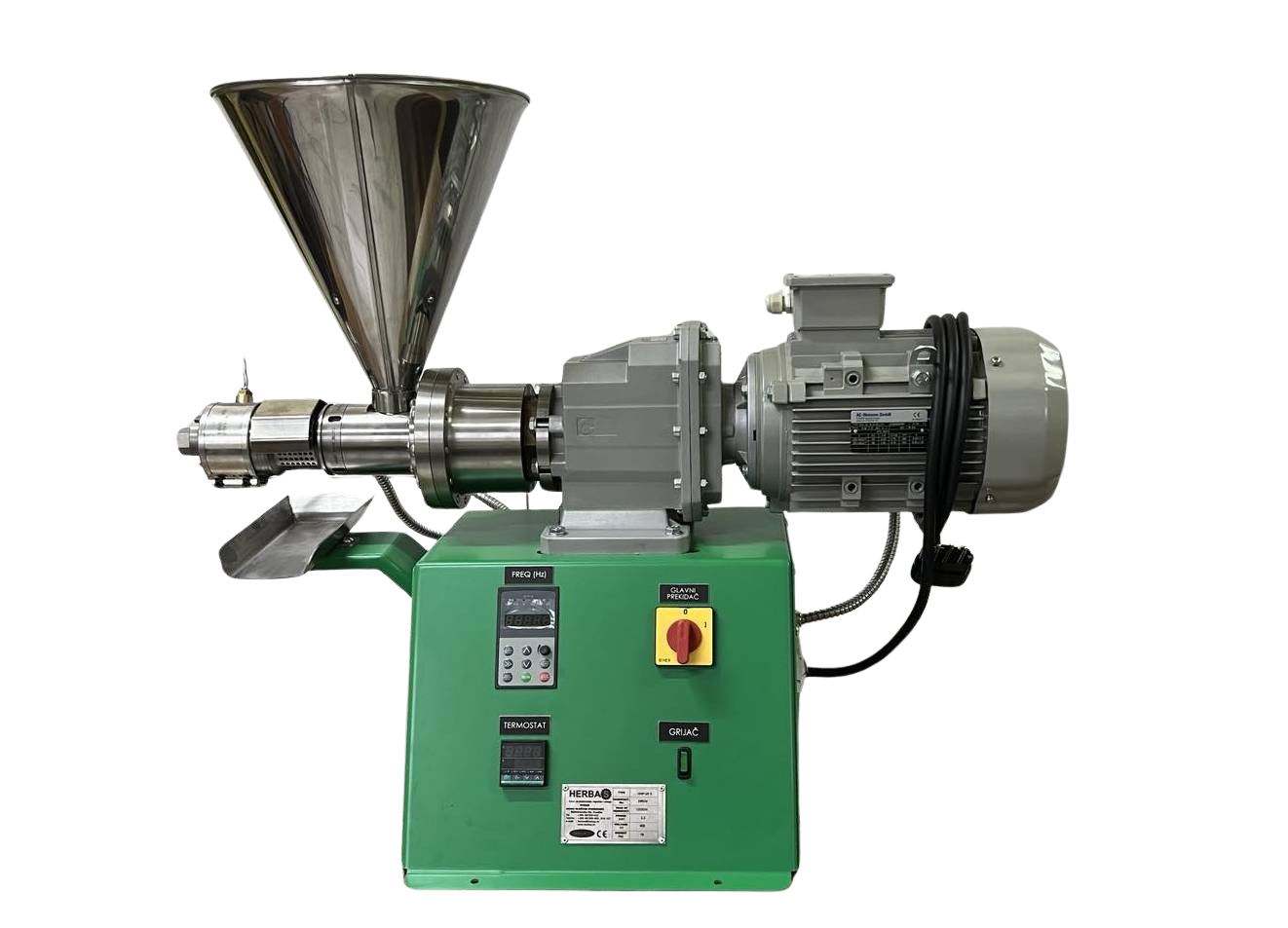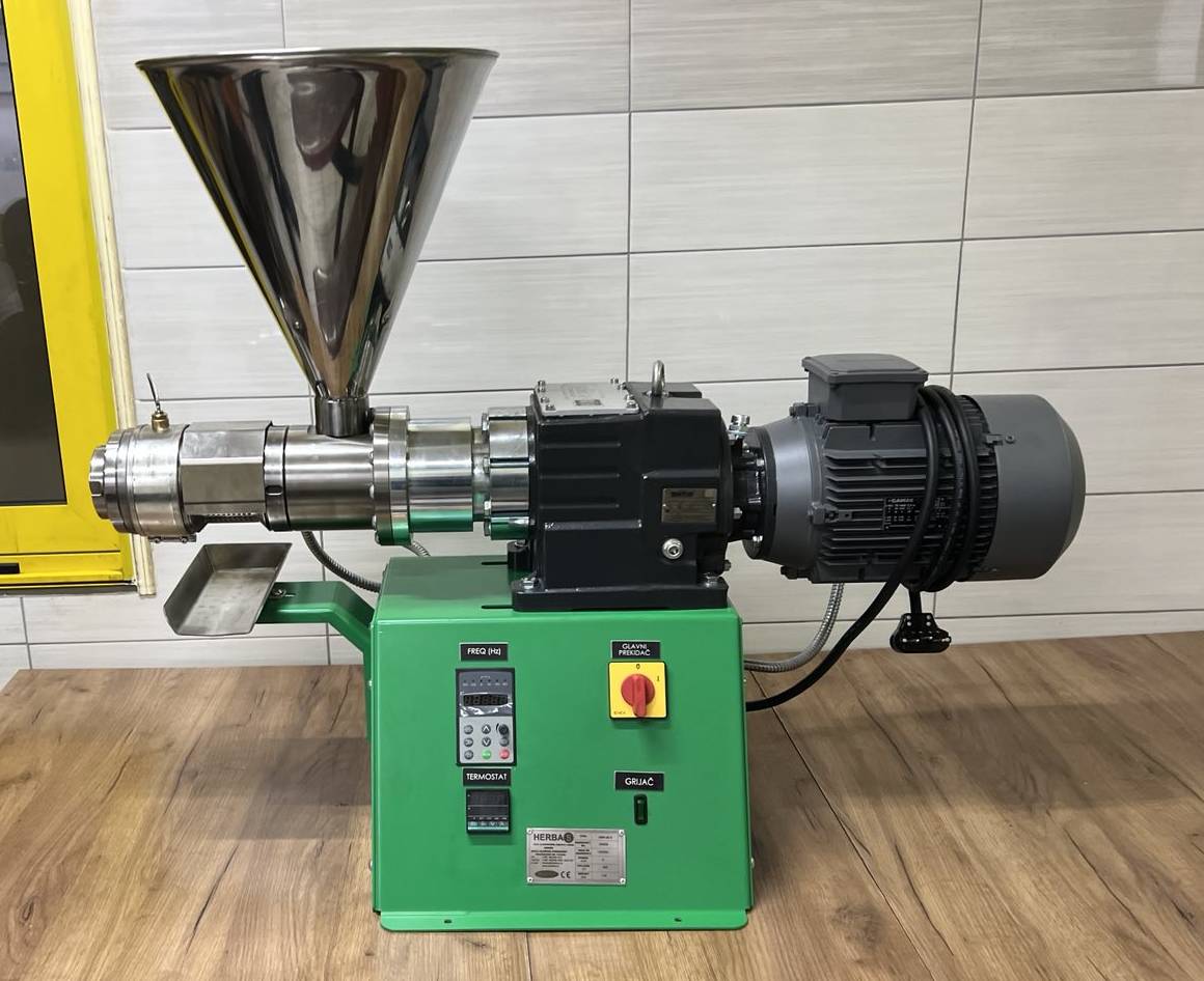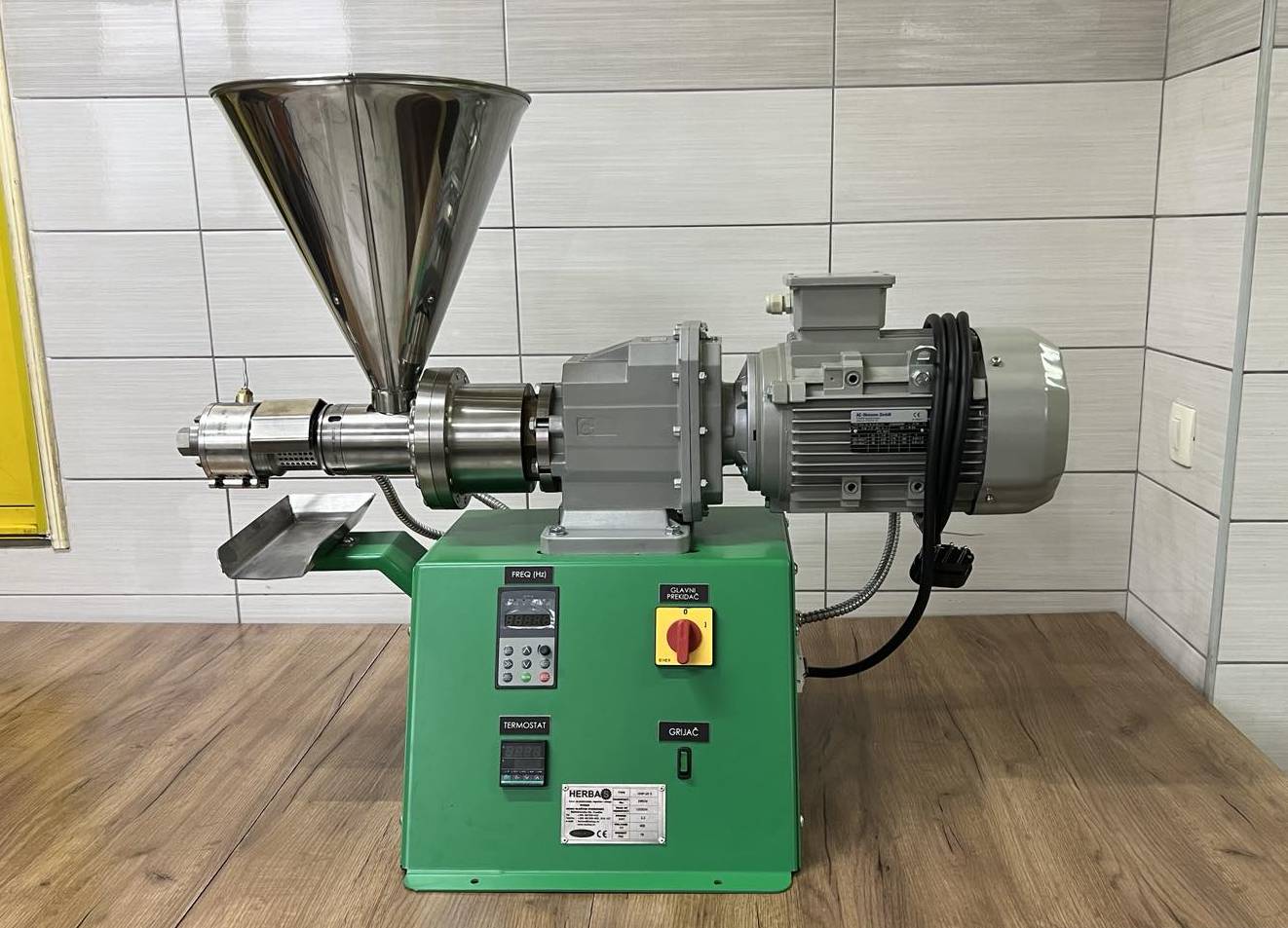 The press is intended for squeezing oil from black grape seeds, white grape seeds, pommegranate seeds, hemp seeds, flax seeds, raspberry seeds, blackberry seeds, rose hip seeds, strawberry seeds, mulberry seeds, poppy seeds, thistle seeds, black cumin seeds, mustard seeds, pumpkin seeds without shell, sesame seeds, chia seeds, coconut flour (dried rendered coconut), sunflower seeds (peeled and unpeeled), rape seeds, poppy seeds, walnuts, hazelnuts, almonds, apricot kernel, plum kernel and peanuts.